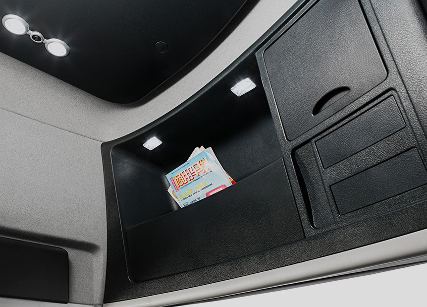 驾驶室内部空间大,可供活动范围大,通过性好;且有多个储藏空间。
